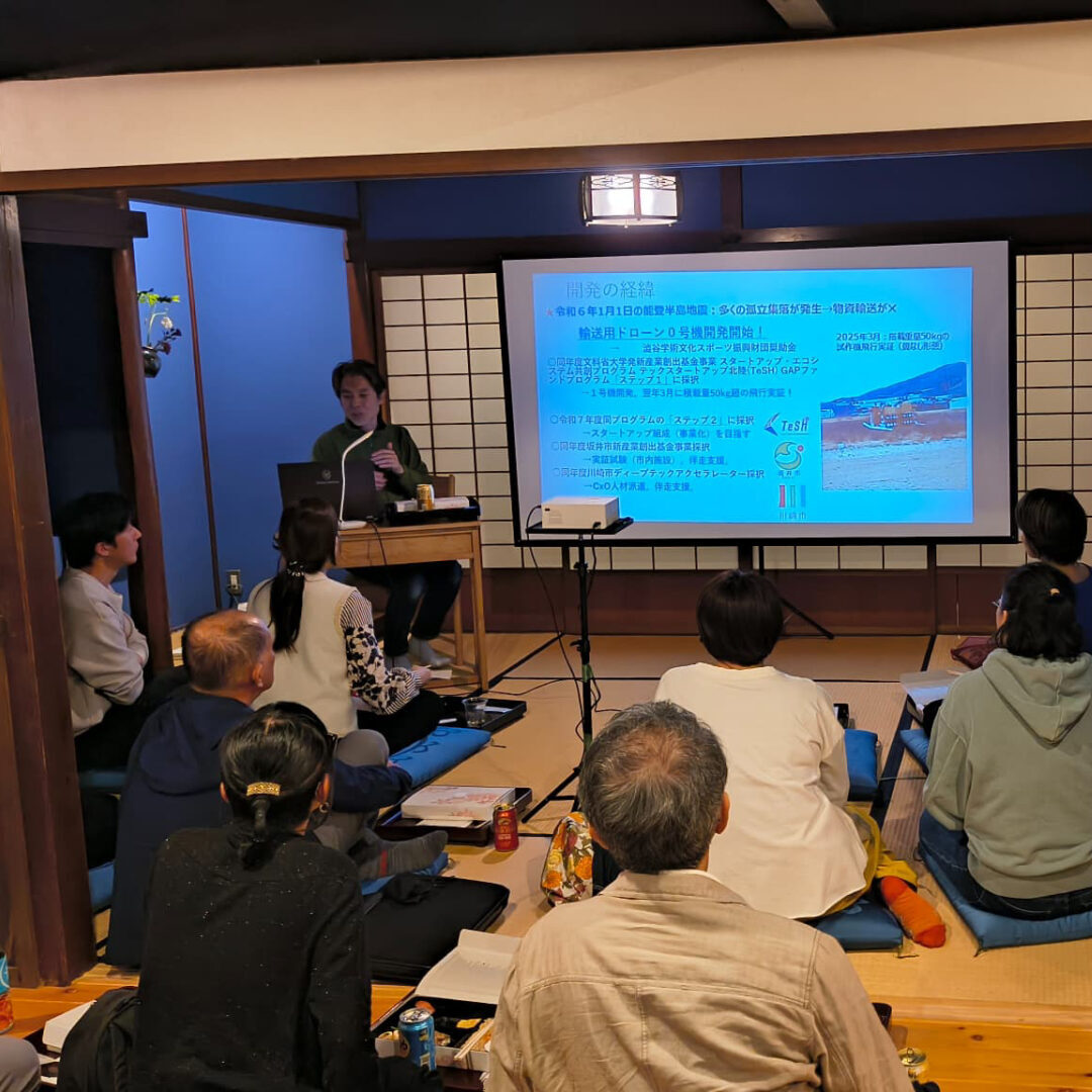 赤坂先生は物流用ドローンの研究に取り組まれており、会場の部屋くらいのスケール感の機体(重さは100kg程度)に50kgの荷物を載せて、50km飛べる機体を目指しているそうです。手取川の河川敷や大学の駐車場で実験を行っていますが、150kgの巨体が頭の上を飛んでいくのを想像すると、怖さとワクワクが同時にあります。
