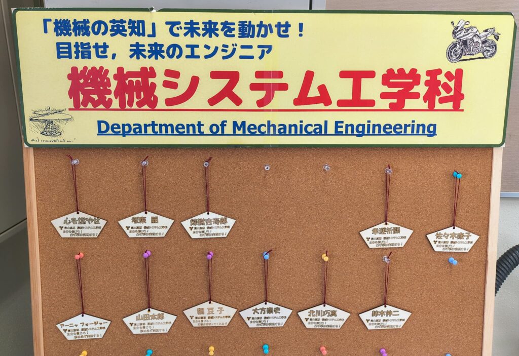 【自分を信じろ!必ず夢は実現する!】と書いた絵馬を機械システム工学科の先生がレーザー加工機で作っていました。本当にご利益があるらしいです!熱い先生がいる高専、ぜひ皆さんも機会があったら足を運んでみてくださいね。