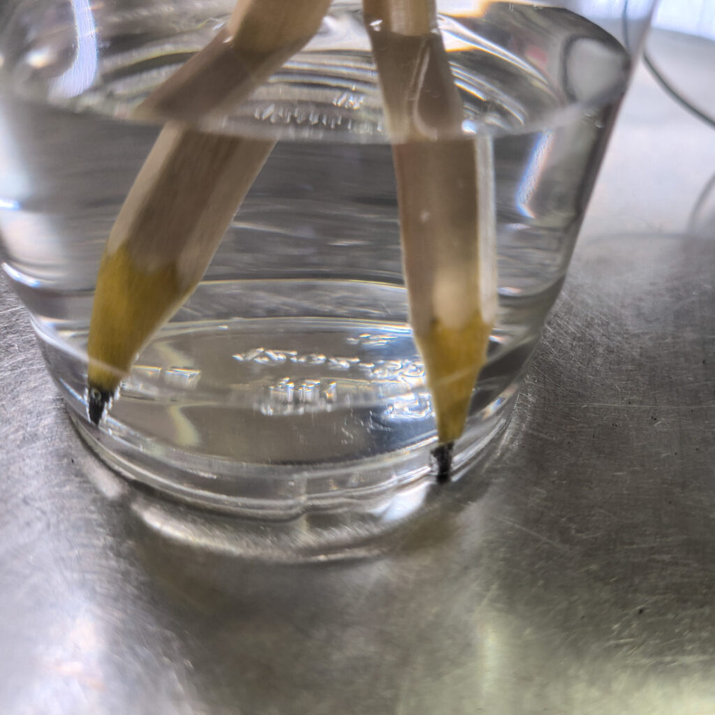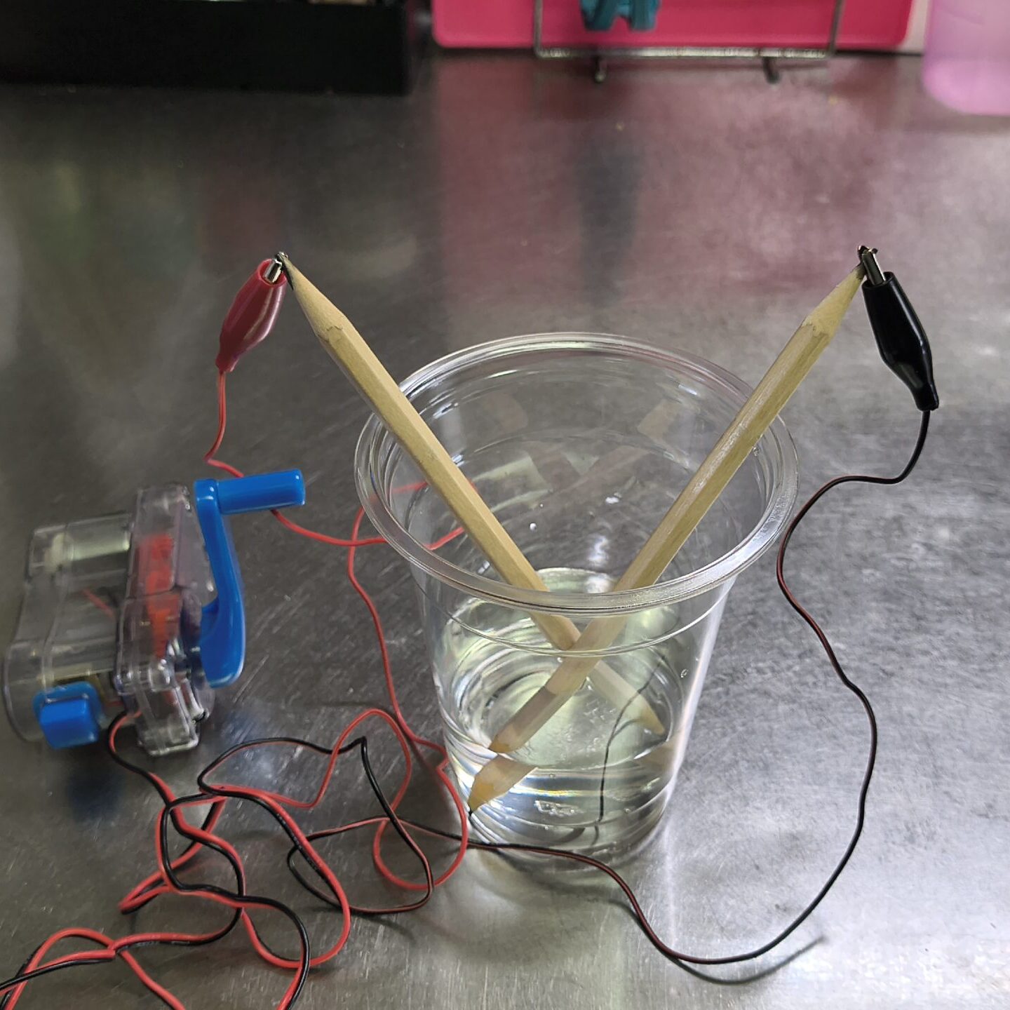 まずは実験1。コップに水を入れて、どろぼう鉛筆(どっちも削ってある鉛筆)を2本入れて、それぞれに手回し発電機の電極をくっつけます。準備はこれだけ!あとはグイグイ発電機を回すと鉛筆の先にプツプツ泡がみえます!!!片方からは水素キターーー✨もう片方からは酸素キターーー✨