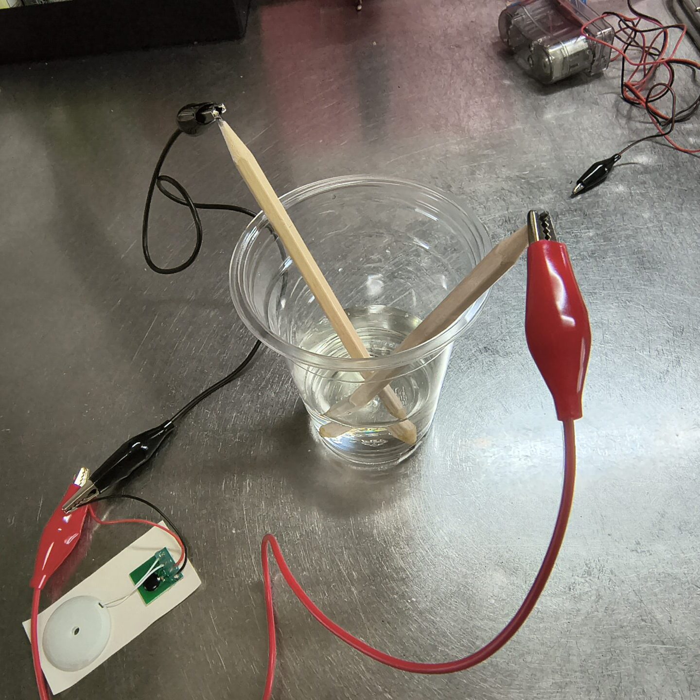 次は実験2。手回し発電機を外し、電子オルゴールをえんぴつにくっつけると・・・・なんと電気が流れ音が流れるのです!これは水素がイオンって状態になって電気が流れだす現象(燃料電池)です😊。